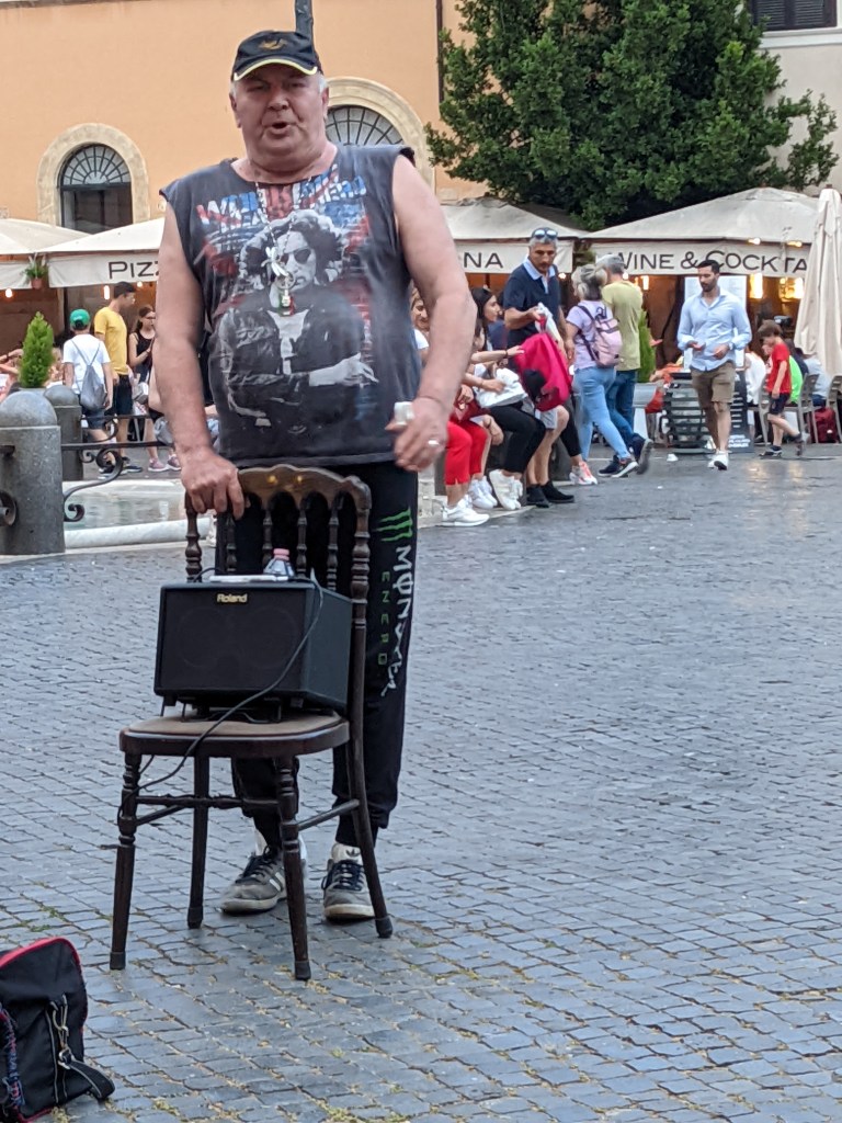 The Piazza Navona always has a couple street performers working the crowds. Musicians, magicians, human statues, mimes; you name it. While people-watching at an outdoor restaurant, we watched with interest as this dude set up shop near our table. See if you can guess his talent …