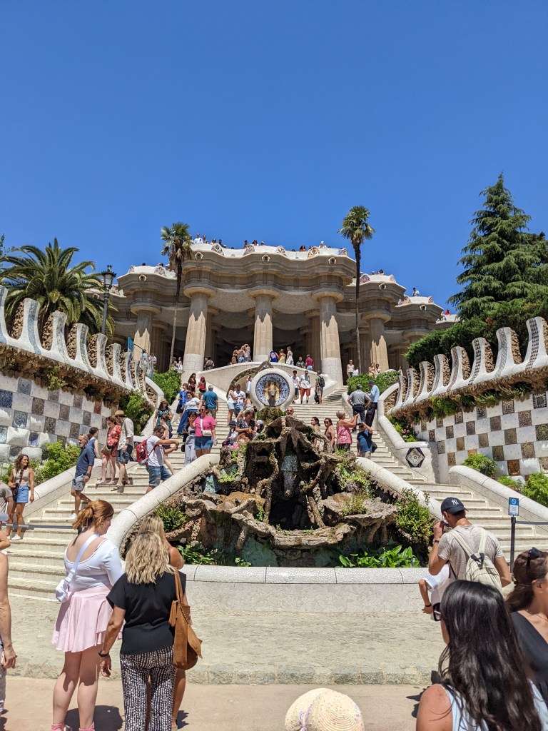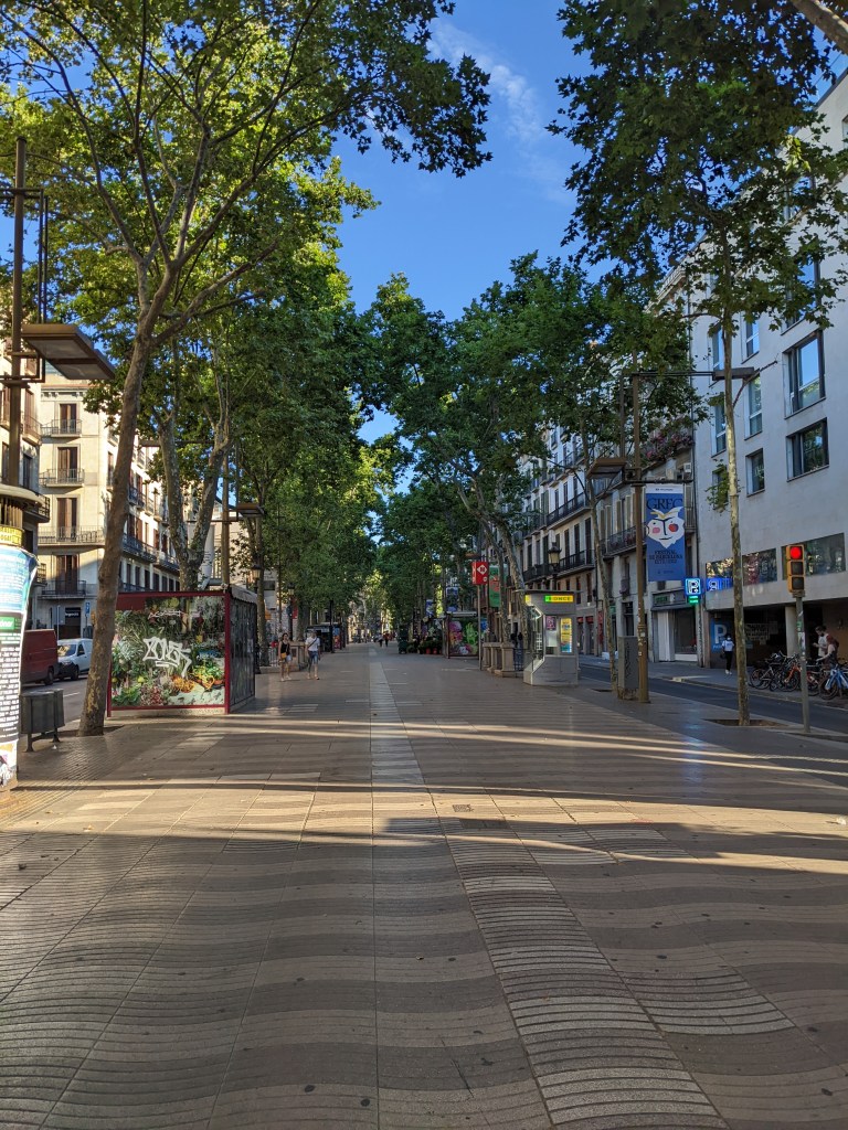 Barcelona is a city of 5 million people, and after putting in nearly 30,000 steps exploring today we feel we have a pretty good flavor of it. The walk-a-thon commenced by traversing the entire length of the Romblas – a century old former creek that is now a wide, 3/4 mile long pedestrian corridor lined with beautiful buildings, restaurants, shops, hotels and markets. Nearly the whole length is shaded and cooled by mature plane trees and if not for the crushing throng of tourists sauntering along like a herd of drunken snails, it would be a most delightful place to hang.