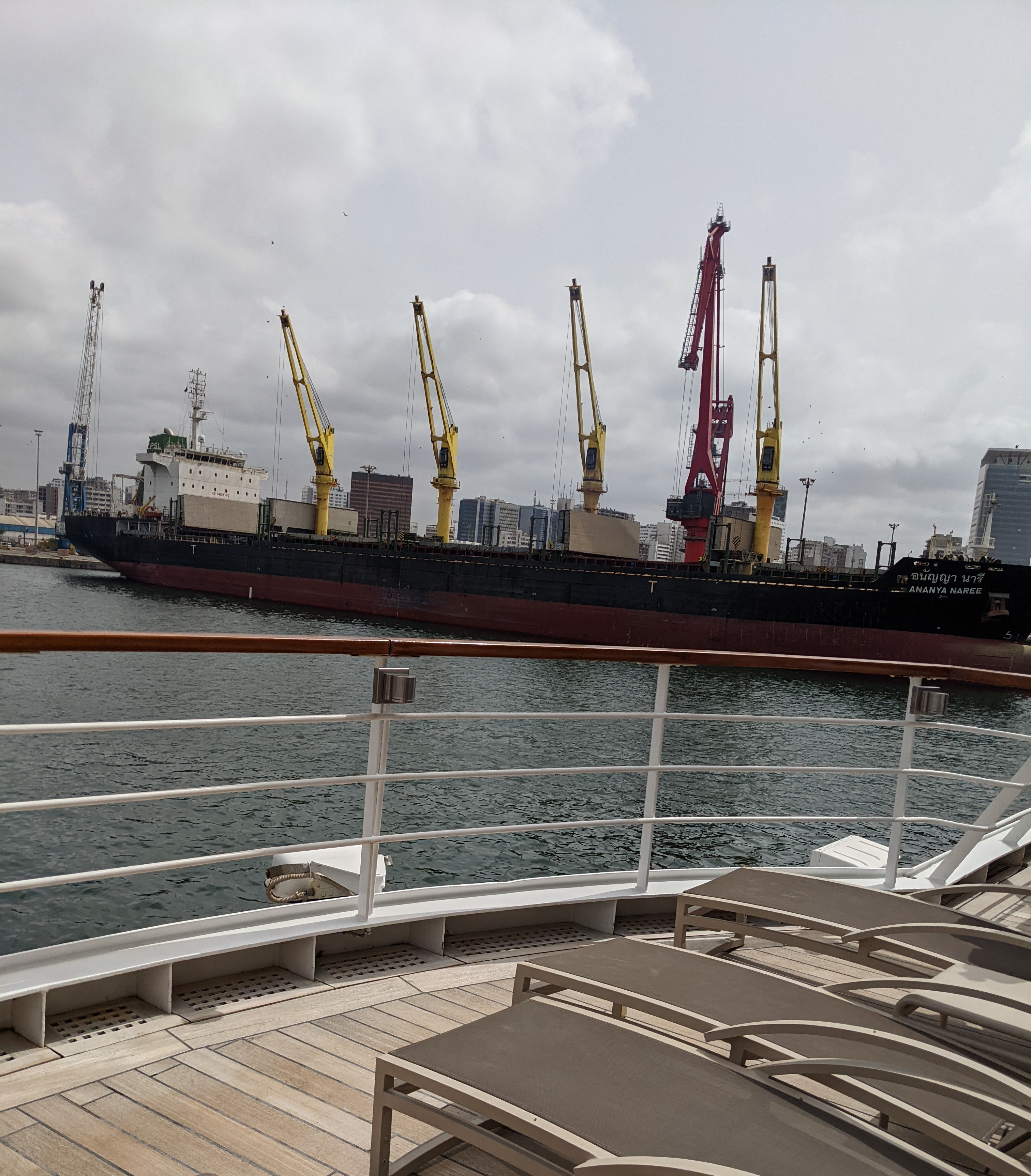 There must not be too many cruise ships coming here, so we were docked smack-dab in the middle of the highly-active commercial port. At first, watching cranes unload containers, sand and fertilizer was interesting – but it quickly became dreary. Our dinner under the stars later that night came with a soundtrack of beeping, grinding, squeaking and other industrial cacophony.